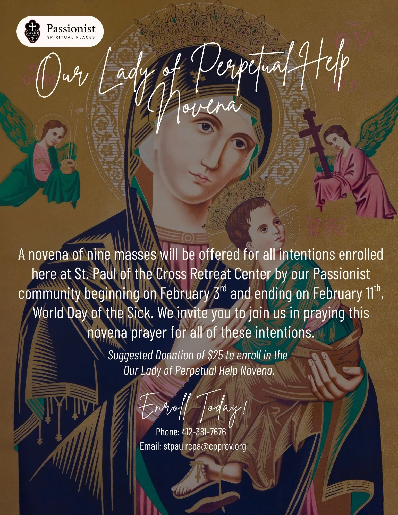 The purchase of a novena card from St. Paul of the Cross Retreat Center ensures that your loved one is enrolled in your selected novena prayer, prayed by our retreat center community and all those who join us in offering this novena for your intentions. When you purchase this novena card, we ask you to commit to joining our community in your selected novena prayer in an effort to offer a spiritual bouquet to all those enrolled. The suggested donation for enrollment in this novena is $25. The card below will be mailed to you or your enrollee as a way of sharing the love and prayer of this novena enrollment.